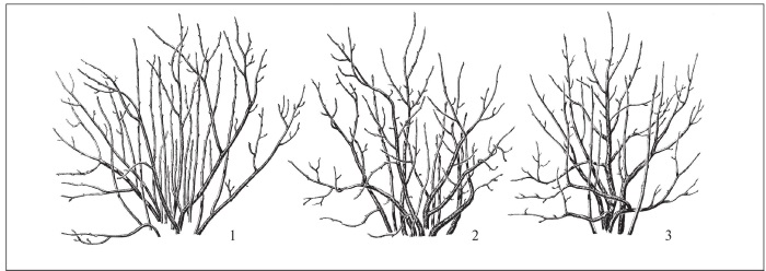 Формирование направлено на создание куста, состоящего из такого числа разновозрастных ветвей, которое соответствует схеме размещения, системе ухода и способу уборки урожая. Чем интенсивнее насаждение, тем меньше ветвей в отдельном кусте и тем больше кустов на единице площади. При разреженных посадках допускается 3–4 ветви одного возраста в кусте, при загущенных – 1–2.
