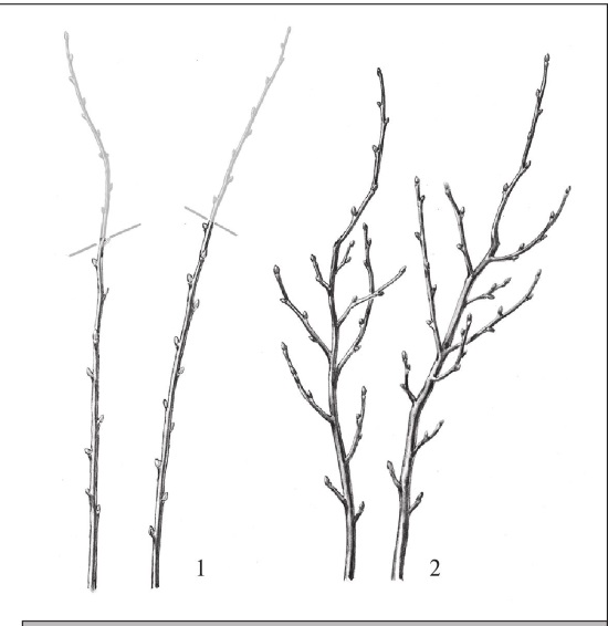 Рис. 328. Укорачивание нулевых ветвей (1) и их ветвление на следующий год (2).