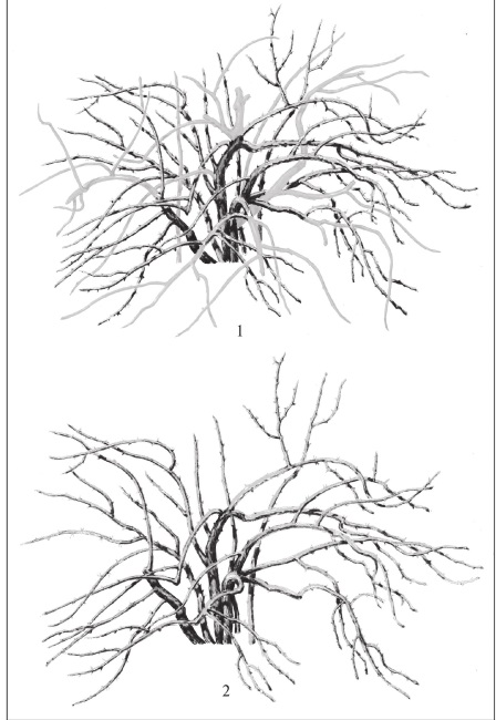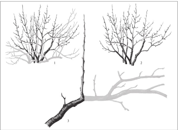1 – до обрезки; 2 – после обрезки; 3 – омолаживание отдельной ветви обрезкой на волчковую.