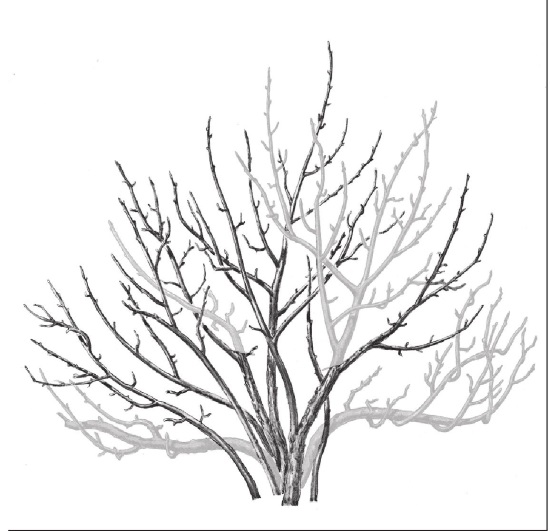 В запущенном кусте много старых, непродуктивных, загущающих ветвей. Молодые ветви – в основном волчкового происхождения. Такие кусты основательно прореживают, удаляя все старые малопродуктивные и ненужные нулевые ветви.
