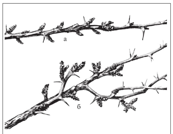 Рис. 323. Плодовые почки (а) и плодовые веточки (б).
