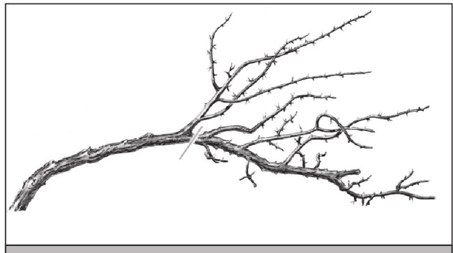 Рис. 341. Омолаживание ветви крыжовника обрезкой на сильное разветвление.