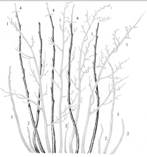 вырезка слабых (1), загущающих и поломанных (2), невызревших верхушек (3); обрезка для стимуляции ветвления (4).