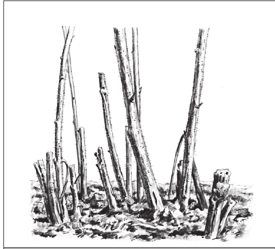 Растения высаживают на расстоянии 1–1,2 м одно от другого. Наиболее сильные ветви при посадке следует ориентировать в плоскости шпалеры. Все вырастающие ветви, а их в кусте должно быть 4–5, веерообразно привязывают к проволокам шпалеры. Следует предусмотреть место еще для двух-трех вновь вырастающих ветвей. В первые 2–3 года обрезают ветви очень слабо, чтобы не вызвать чрезмерного ветвления. Когда ветви достигнут высоты третьей, самой верхней проволоки, их каждый раз обрезают переводом на нижерасположенные ветви. Все сильные вертикальные ветви, которым нет места на шпалере, вырезают или используют для замены стареющих. Омолаживать ветви следует на пятом-шестом году их роста. Нулевых побегов каждый год оставляют ровно столько, сколько может быть использовано для замены стареющих ветвей. Остальные вырезают на уровне почвы.