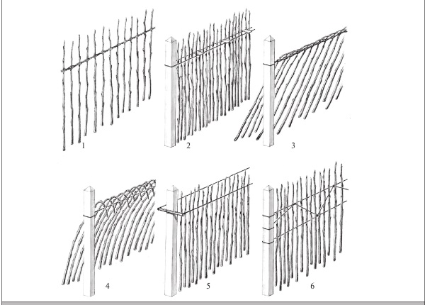 1 – переплетением стеблей шпагатом; 2 – шпалера с двумя проволоками; 3 – шпалера для высокостебельных растений; 4 – шпалера для высокостебельных растений, подвязка с изгибанием верхушек; 5 – шпалера с двумя проволоками, натянутыми на расстоянии 40–50 см, ряд широкий, стебли не подвязаны; 6 – расстояние между проволоками шпалеры регулируют по ширине в зависимости от необходимости (по Е.И. Ярославцеву).