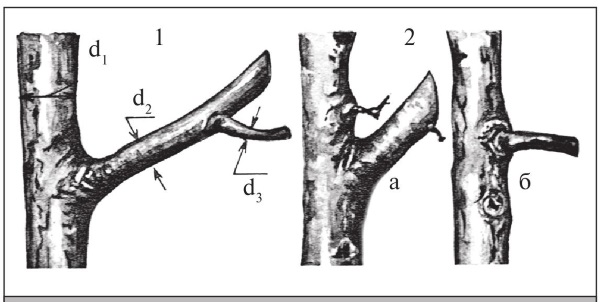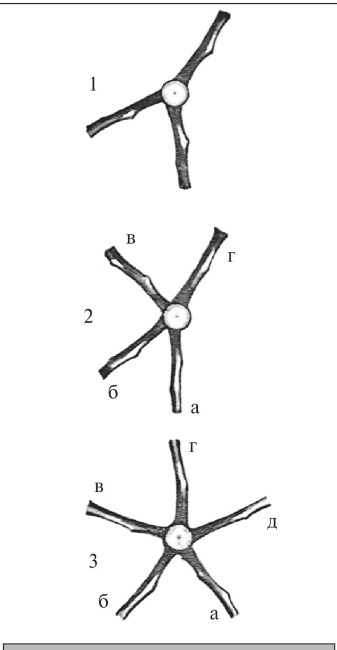 1 – при трех ветвях наличие одного угла в 70–75° допустимо; 2 – при четырех ветвях две (б, в) не имеют хороших углов расхождения, а две (а, г) имеют только с одной стороны; 3 – закладка пяти ветвей из смежных почек не обеспечивает ни одного хорошего угла расхождения.