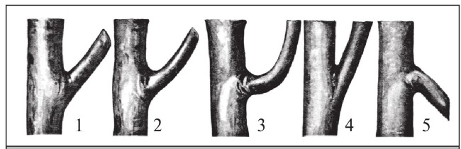 1 и 2 – хороший; 3 – допустимый, если на некотором расстоянии от штамба ветвь приподнимается и растет кверху: 4 – недопустимый (слишком острый), возможен разлом; 5 – недопустимый (ветвь направлена вниз и не может быть полноценной).