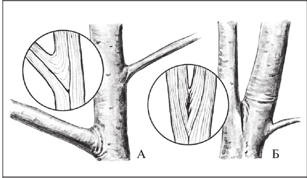 А – при достаточно большом угле отхождения слои древесины не имеют разрывов, прочность крепления отличная; Б – при слишком остром угле отхождения слои древесины не срастаются: они разделены отмершей корой, остающейся в пазухе угла; отлом в большинстве случаев неизбежен.