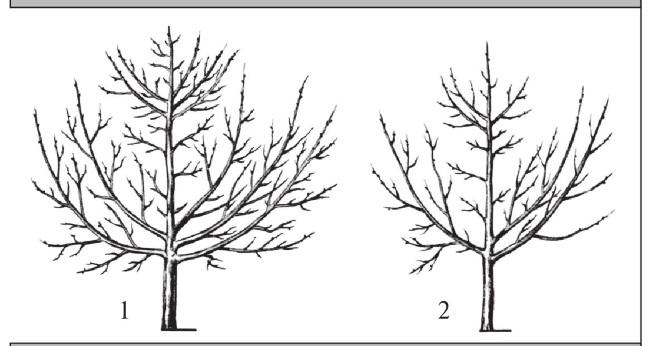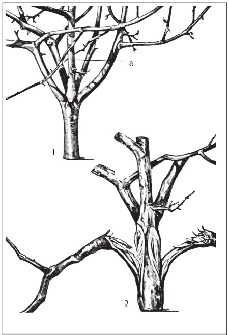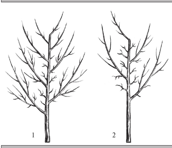Рис. 123. Измененно-лидерная крона с восемью (1) и четырьмя ветвями (2).