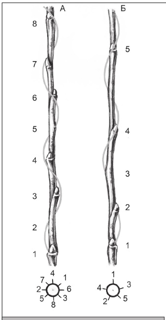 На схемах цифрами обозначены порядковые номера почек (листьев), располагающихся на одной ортостихе.