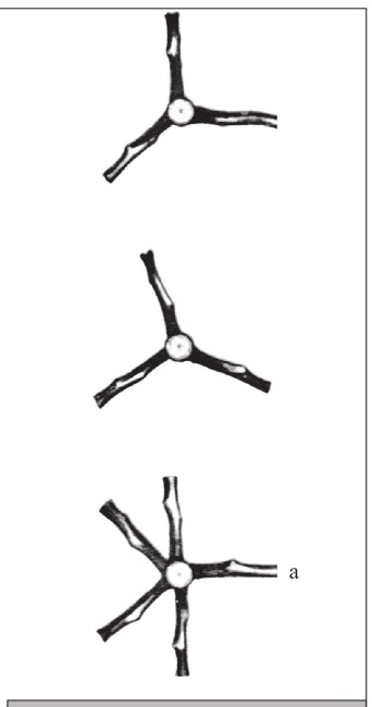 Угол расхождения ветвей тесно связан с цикличностью листорасположения. В проекции листья вдоль оси побега располагаются прямыми рядами. Если основания соседних листьев или почек соединить условной линией, то она, сделав вполне определенное число оборотов вокруг стволика (ветви), выйдет на сходный по размещению лист. При продлении спирали цикл повторится. Линия, соединяющая листья, расположенные строго один над другим, называется ортостихой. Цикличность листорасположения обычно выражают дробью, где числитель указывает число оборотов спирали вокруг ствола, а знаменатель – число междоузлий между двумя соседними листьями одной ортостихи. У яблони чаще всего цикличность листорасположения 2/5 и 3/8, хотя иногда (очень редко) может встречаться 1/3, 4/11, 5/13. При цикле 2/5 и 3/8 нельзя закладывать 5 смежных ветвей, так как угол их расхождения будет в первом случае около 70°, а во втором даже меньше 60°. В группе из четырех ветвей, согласно циклу листорасположения, две будут лишены хороших углов расхождения. При закладке трех ветвей в ярусе лишь один угол недостаточно хорош, но это допустимо. Таким образом, исходя из объективно существующей закономерности листорасположения, закладка более трех смежных основных ветвей в одном ярусе недопустима. Но это справедливо лишь при формировании сферических крон с явно выраженным остовом при ярусном размещении ветвей. Если крона состоит только из обрастающих ветвей (шпиндельбуш, например), ни количество их, ни углы расхождения не имеют значения. Здесь основной критерий – световой режим.