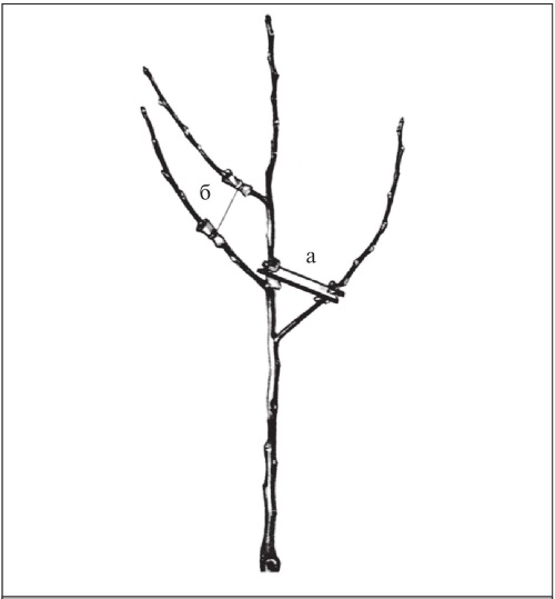 При закладке пяти ветвей в ярусе хорошие углы расхождения с обеих сторон имеет только одна ветвь (а). При трех ветвях в ярусе лучшие углы расхождения получаются при закладке их из трех смежных почек: 1–2–3; 2–3–4; 3–4–5.