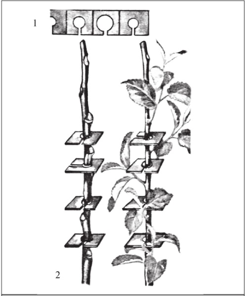 1 – лента с отверстиями разных диаметров, соответствующих толщине однолеток в верхней части, и разрезом для удобства установки над почкой; 2 – однолетки с установленными над верхними почками накладками (углы отхождения в результате становятся 70–75°).