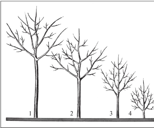 1 – высокий; 2 – средний; 3 – низкий; 4 – кустовидная крона.