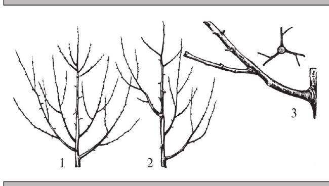 Первые основные ветви обычно закладывают в питомнике. Для этого однолетку обрезают на высоте около 100 см. Над верхней почкой при такой обрезке иногда оставляют шип для подвязки побега продолжения. На оставшейся части закладывают нужное количество ветвей на расстояниях, определенных формой кроны.