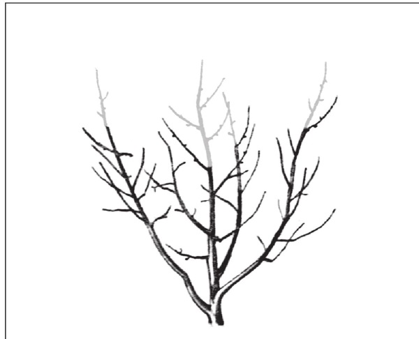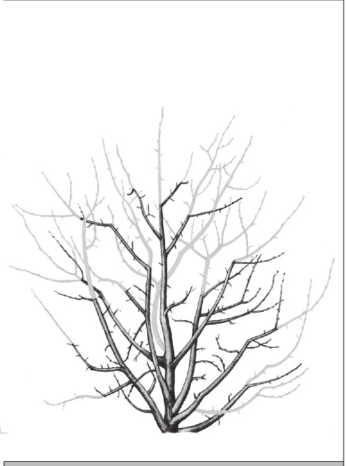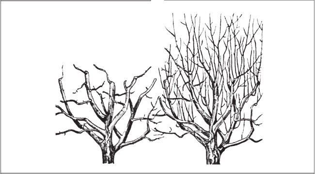 Рис. 245. Значительно подмерзшее дерево (средняя степень). Ветви обрезают до участков, где сохранились молодые достаточно сильные ветви. Голенастые ветви сильно укорачивают.