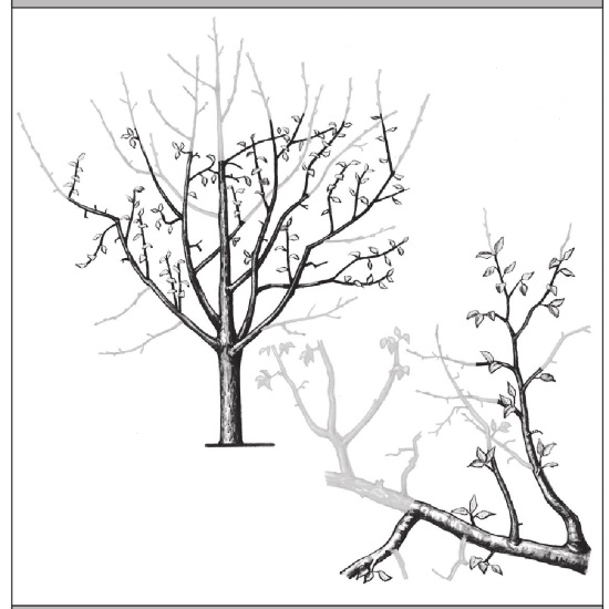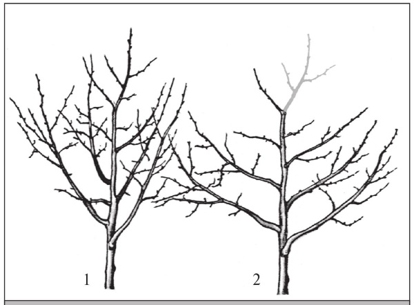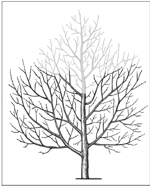 Рис. 252. Раскрытие центра кроны. Через 1–2 года можно обрезать еще на ярус ниже.