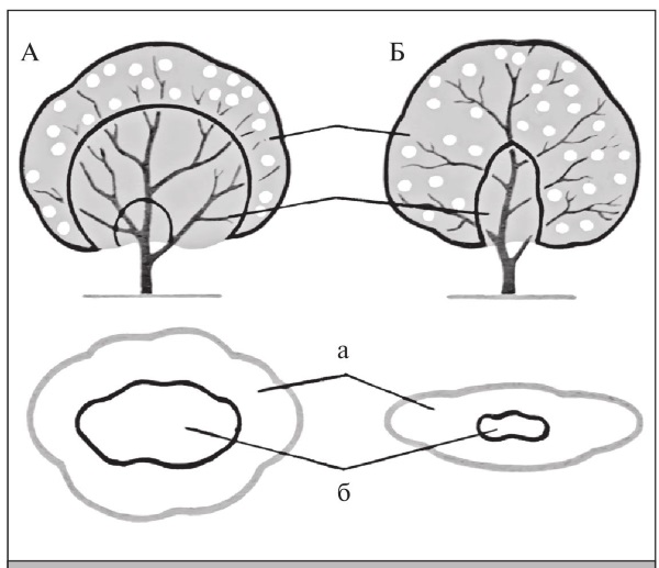 Рис. 249. Продуктивная зона в зависимости от формы кроны: