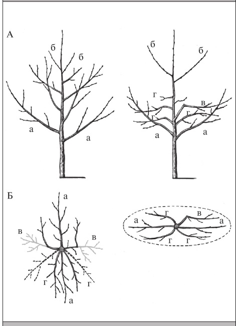а – выделение основных ветвей первого яруса; б – выделение основных ветвей второго яруса; изменение ориентации промежуточных ветвей обрезкой (в), отгибанием (г). А – вид в вертикальной плоскости; Б – вид в проекции.