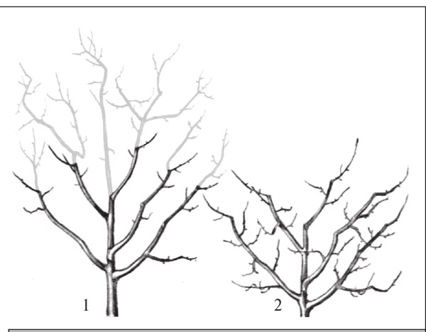 Рис. 254. Переформировка округлой кроны в пальметту: 1 – до; 2 – после.