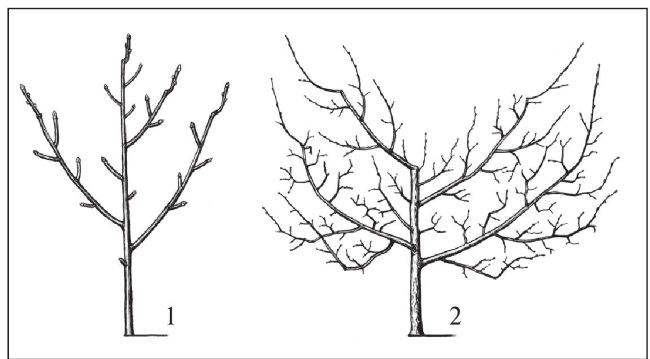 1 – молодого; 2 – взрослого. В обоих случаях в год обрезки сильных побегов практически не образуется.