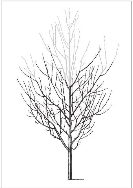 Рис. 255. Окончание формирования обрезкой центрального проводника на одиночную боковую ветвь. Все остальные ветви в верхней части кроны также обрезают на перевод на ветви, направленные к периферии.