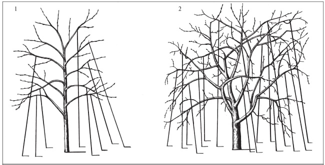 1 – у взрослого дерева листовой полог, обрастающая древесина, плодоношение переместились на периферию кроны, центр оголен; 2 – крона снижена, открыт доступ света в глубинные части: обрастание усилилось.