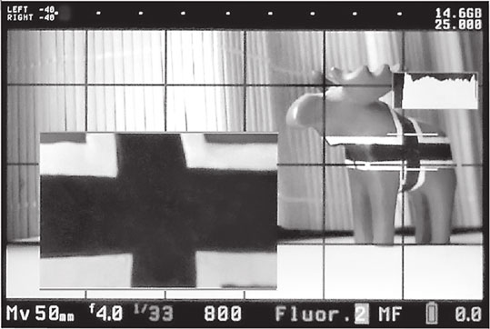 Интерфейс прошивки Magic Lantern. В нижнем левом углу показано окошко Magic Zoom, подсвеченное зеленым цветом. Это говорит, что объект находится в фокусе