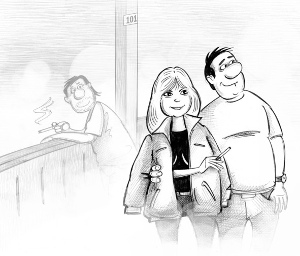 Тут сбоку раздался смех, и из тумана вышла влюбленная парочка. Девушка пыталась прикурить, но пальцы ее не слушались. Я помог ей.