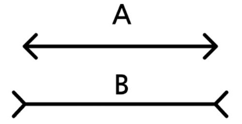 Посмотрите на картинку выше. Как думаете, какой отрезок длиннее: А или В? Если вы делаете это упражнение впервые, приостановите чтение и сперва посмотрите на изображение.