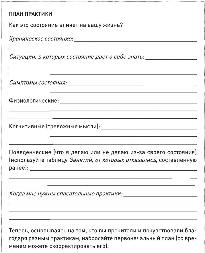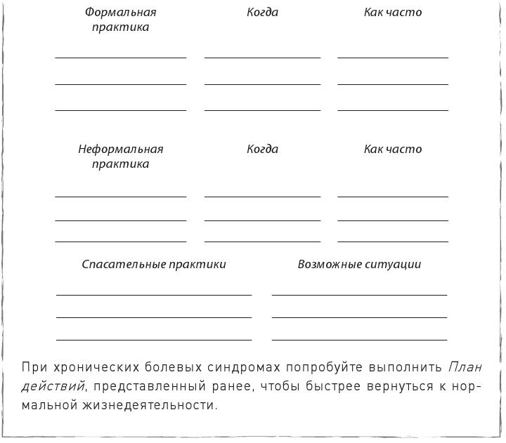 Разработка планаПопробуйте составить небольшой план действий по работе с хронической болью или состоянием, связанным со стрессом. Следующая таблица поможет вам в этом: