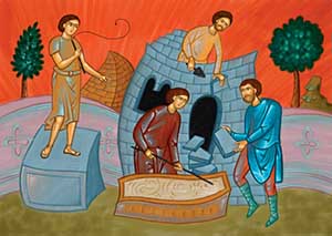 А пекарь тем временем рассказал свой сон: будто на его голове три корзины, и из верхней корзины птицы клюют всякие лакомства. Иосиф сказал ему: «Через три дня фараон повесит тебя, и птицы будут клевать твоё тело».