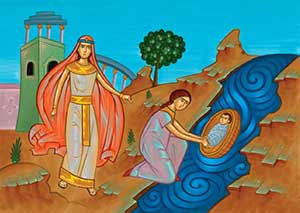 В это время в одной еврейской семье родился мальчик. Три месяца мать прятала своего сына, а когда прятать уже стало невозможно, она взяла ковчег из папируса, положила в него младенца и оставила на берегу Нила, в тростнике. Сестра мальчика стояла невдалеке и смотрела, что будет дальше.