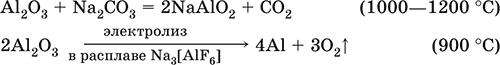 Получение алюминия в промышленности – электролиз Al2O3 в расплаве криолита Na3[AlF6] при 950 °C: