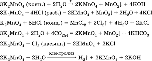 Манганат калия К2MnO4. Оксосоль. Темно-зеленый, плавится под избыточным давлением O2. В растворе устойчив только в сильнощелочной среде. Зеленая окраска раствора отвечает иону MnO42-. Медленно разлагается при разбавлении раствора водой, быстро – при подкислении. Проявляет окислительно-восстановительные свойства.