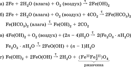 Железо медленно окисляется во влажном воздухе (ржавеет), из-за рыхлости коричневой ржавчины (FeIIFe2III)O4 защитный слой не создается. Процесс ржавления: