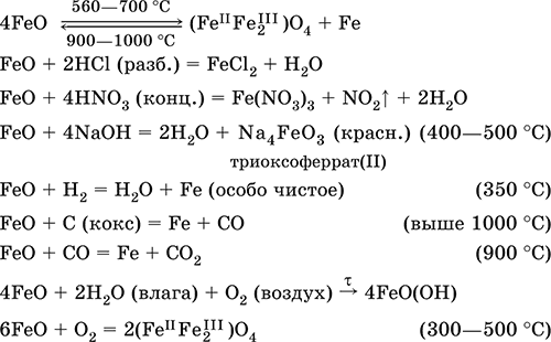 Оксид железа(II) FeO. Амфотерный оксид с большим преобладанием основных свойств. Черный, имеет ионное строение Fe2+O2-. При нагревании вначале разлагается, затем образуется вновь. Не образуется при сгорании железа на воздухе. Не реагирует с водой. Разлагается кислотами, сплавляется со щелочами. Медленно окисляется во влажном воздухе. Восстанавливается водородом, коксом. Участвует в доменном процессе выплавки чугуна. Применяется как компонент керамики и минеральных красок. Уравнения важнейших реакций: