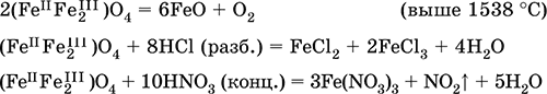 Оксид дижелеза (III) – железа(II) (FeIIFe2III)O4. Двойной оксид. Черный, имеет ионное строение Fe2+(Fe3+)2(O2-)4. Термически устойчив до высоких температур. Не реагирует с водой. Разлагается кислотами. Восстанавливается водородом, раскаленным железом. Участвует в доменном процессе производства чугуна. Применяется как компонент минеральных красок (железный сурик), керамики, цветного цемента. Продукт специального окисления поверхности стальных изделий (чернение, воронение). По составу отвечает коричневой ржавчине и темной окалине на железе. Применение брутто-формулы Fe3O4 не рекомендуется. Уравнения важнейших реакций: