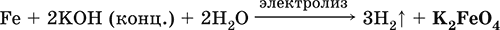 Fe + 2KOH + 2KNO3 = K2FeO4 + 3KNO2 + H2O (420 °C)