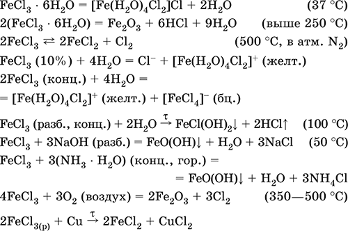 Хлорид железа(III) FeCl3. Бескислородная соль. Черно-коричневый (темно-красный в проходящем свете, зеленый в отраженном), гидрат темно-желтый. При плавлении переходит в красную жидкость. Весьма летуч, при сильном нагревании разлагается. Связи Fe – Cl преимущественно ковалентные. Пар состоит из мономеров FeCl3 (треугольное строение, sр2-гибридизация, преобладают выше 750 °C) и димеров Fe2Cl6 (точнее, Cl2FeCl2FeCl2, строение – два тетраэдра с общим ребром, sр3-гибридизация, преобладают при 316–750 °C). Кристаллогидрат FeCl3 6Н2O имеет строение [Fe(H2O)4Cl2]Cl • 2Н2O. Хорошо растворим в воде, раствор окрашен в желтый цвет; сильно гидролизован по катиону. Разлагается в горячей воде, реагирует со щелочами. Слабый окислитель и восстановитель.