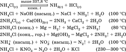 Получение: взаимодействие NH3 с HCl в газовой фазе или NH3 Н2O с HCl в растворе.