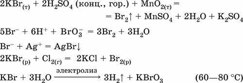 Бромид калия КBr. Бескислородная соль. Белый, негигроскопичный, плавится без разложения. Хорошо растворим в воде, гидролиза нет. Восстановитель (более слабый, чем KI).