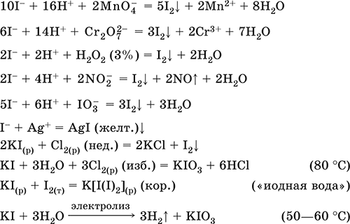 Иодид калия KI. Бескислородная соль. Белый, негигроскопичный. При хранении на свету желтеет. Хорошо растворим в воде, гидролиза нет. Типичный восстановитель. Водный раствор KI хорошо растворяет I2 за счет комплексообразования.