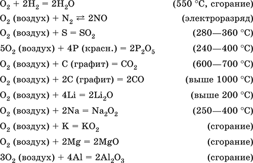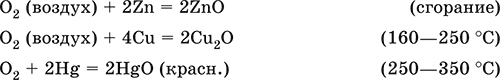 Кислород вызывает ржавление (медленное окисление) железа, уравнения реакций см. в 11.3. Особенно активен атомарный кислород О0 (активность выше, чем у озона O3), обычно получаемый непосредственно в зоне реакции при термическом разложении многих веществ.