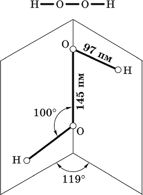 Пероксид водорода Н2O2. Бинарное соединение. Молекула Н2O2 неплоская, имеет строение с σ-связью О – О на ребре и связями Н – О на плоскостях двугранного угла. Степень окисления кислорода равна – I. Группа – О – О– называется пероксогруппой.