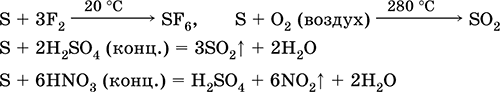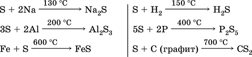 Сера, особенно порошкообразная, обладает высокой активностью при нагревании. Реагирует как окислитель с металлами и неметаллами: