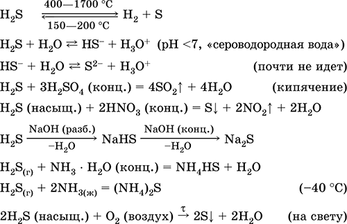 (sp3-гибридизация, валетный угол Н – S—Н далек от тетраэдрического). Неустойчив при нагревании выше 400 °C. Малорастворим в воде (2,6 л/1 л Н2O при 20 °C), насыщенный раствор децимолярный (0,1М, «сероводородная вода»). Очень слабая кислота в растворе, практически не диссоциирует по второй стадии до ионов S2- (максимальная концентрация S2- равна 1 10-13 моль/л). При стоянии на воздухе раствор мутнеет (ингибитор – сахароза). Нейтрализуется щелочами, не полностью – гидратом аммиака. Сильный восстановитель. Вступает в реакции ионного обмена. Сульфидирующий агент, осаждает из раствора разноокрашенные сульфиды с очень малой растворимостью.