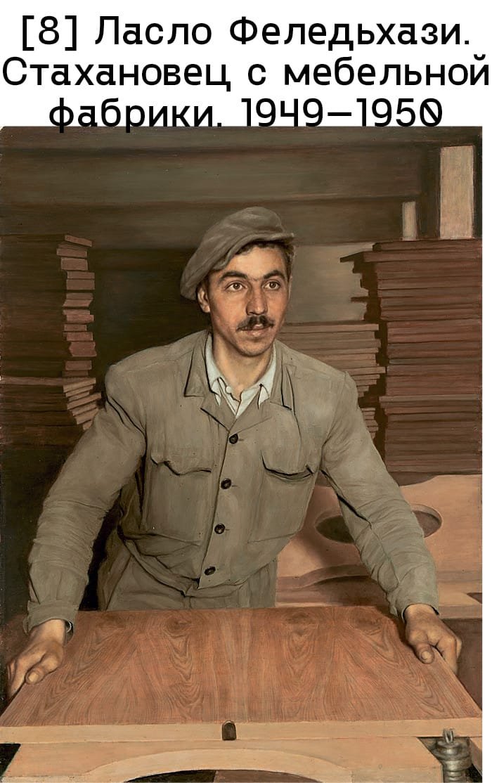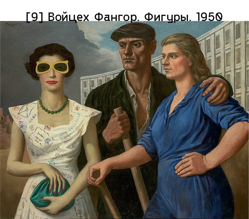 Характерные темы для социалистического реализма – изображение новых людей как идеальных граждан коммунистического будущего, продвижение новых общественных ценностей (образование для всех, равенство мужчин и женщин на рабочем месте), идея о том, что промышленные рабочие являются передовым классом. Сверхчеловеческие усилия героев труда прославлял венгр Ласло Феледьхази в своей картине Стахановец с мебельной фабрики (1949–1950): прописывая всё детально, он изображает рабочего со стальной решимостью во взгляде, застывшего на мгновение среди аккуратно сложенных досок [илл. 8]. Анни Гашпар Фелекине, посвятившая себя теме эмансипации женщины при социализме, стала автором Кондуктора со свистком (1950): героиня картины готовится дать сигнал к отправлению поезда. В Фигурах (1950) поляк Войцех Фангор изображает мужчину с точеным лицом и крепкую работницу в синем рабочем комбинезоне, глядящих на модно одетую женщину в солнечных очках, с ожерельем на шее и сумочкой в руках [илл. 9]. Резкий контраст между капиталистическим прошлым и социалистическим будущим символически отражают руины и темные тучи позади представительницы бывшего привилегированного класса в сравнении с новым жилищным массивом и синим небом за спиной двух рабочих – идеологический индикатор ясно дает понять, на чьей стороне история. В то же время образ «буржуазки» полон двусмысленности, воплощая подавленное стремление к западным свободам и удовольствиям.