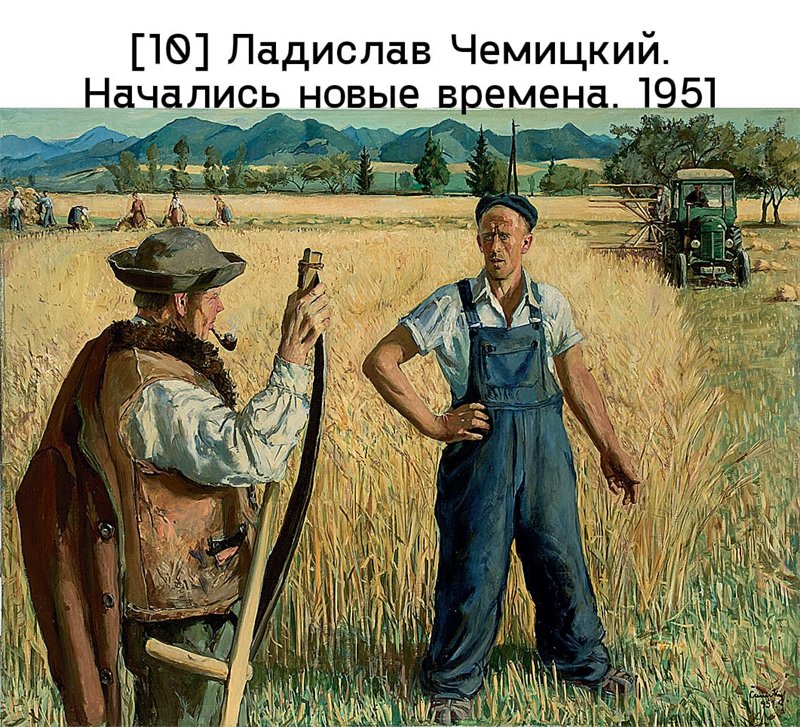 Официальное искусство тщательно запечатлевало достижения сталинской политики ускоренной индустриализации, развития инфраструктуры и коллективизации в сельском хозяйстве. В Строительстве аллеи Сталина (1953) Хайнц Лёффлер изобразил образцовую городскую стройку – Берлин, поднимающийся из руин в послевоенные годы. Большая фотография героя труда и красные знамена, свисающие с лесов, придают идеологическую окраску оживленной сцене: краны, вагоны и лихорадочная работа. Молодежная бригада на стройплощадке (1950) Хелены Краевской – картина, изображающая восстановление Варшавы, полностью разрушенной во время войны, посредством добровольных народных кампаний; такое символическое действие, как укладка кирпича, занимает центральное место и в картине Александра Кобздея Передай мне кирпич (1949), прославляющей коллективный трудовой порыв. Франтишек Билек тщательно запечатлел – с высоты, чтобы в полной мере передать величественность сооружения, – возведение гидроэлектростанции на реке Влтава в Чехословакии в картине Строительство Слапской плотины (1958). Товарищ Ракоши в Сталинвароше (1953) Белы Бана изображает встречу (в одном из нескольких восточноевропейских городов, названных в честь Сталина) генсека ЦК ВПТ с будущими жителями социалистического города. Общественно-политические изменения в словацкой деревне отражены – в несколько театрализованной манере – Ладиславом Чемицким на картине Начались новые времена (1951): крестьянин в традиционной одежде, с косой и трубкой в зубах, стоит лицом к лицу с трактористом в синем комбинезоне, который символизирует социалистическое будущее, основанное на технических достижениях [илл. 10].