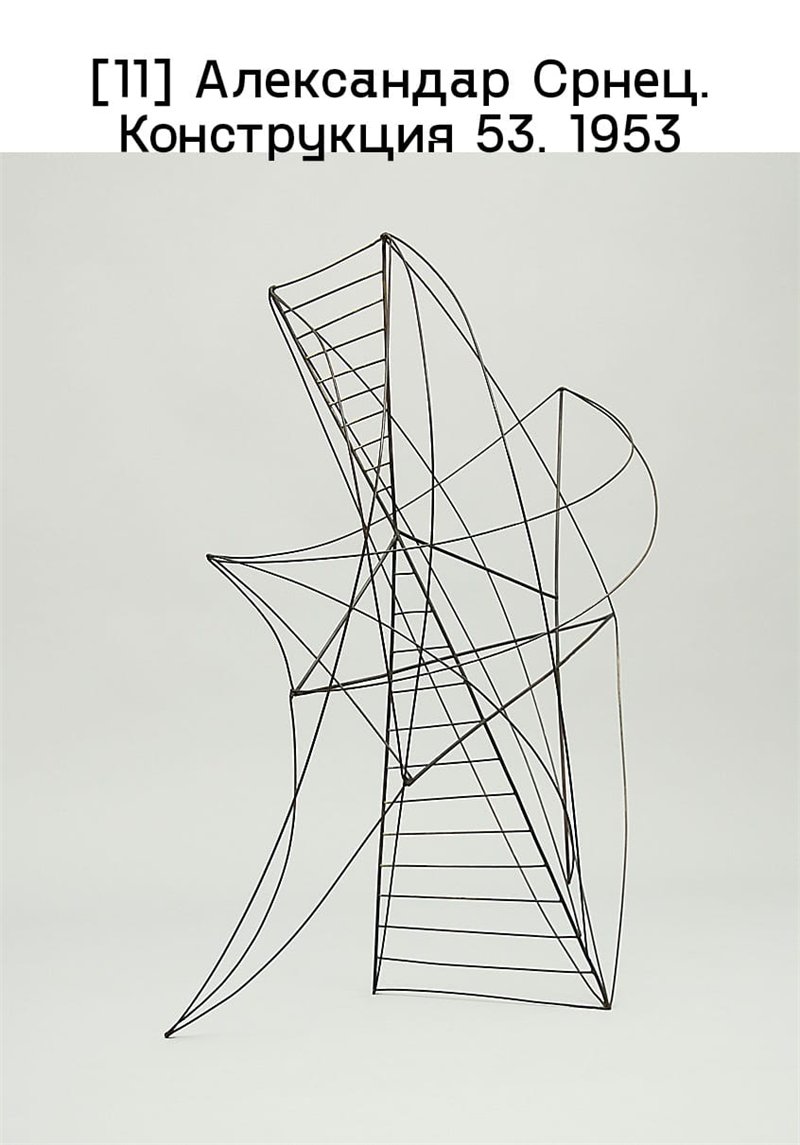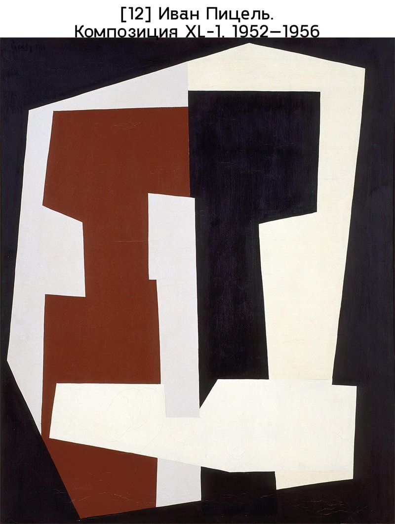 Быстрая индустриализация Югославии в 1950-е годы не соответствовала сталинской модели, навязанной остальной Восточной Европе: здесь был взят курс на рабочее самоуправление и экономическое сотрудничество с Западом. Это значит, что в художественной практике универсализм и интернационализм модернистской культуры проявлялся через призму стремлений социалистического общества. Загребская группа EXAT 51, образовавшая свое название от experimental atelier («экспериментальная мастерская») и года создания своего манифеста, просуществовала до 1956 года. Входившие в группу художники Иван Пицель, Александар Срнец, Владо Кристль, архитекторы Венцеслав Рихтер, Звонимир Радич и Божидар Рашица отстаивали абстракцию, синтез прикладных и изобразительных искусств, стремясь сформировать коллективное представление об искусстве, необходимое для преобразования общества. Приверженность ее участников к неоконструктивистскому геометризму ощущается в кинетических скульптурах Срнеца, таких как Конструкция 53 (1953), задуманная как экспериментальная попытка перевода его абстрактных рисунков в динамичные пространственные композиции [илл. 11]. Кристль неизменно называл свои картины Композициями, составляя из геометрических прямо– и криволинейных форм цветные блоки. Работы Рашицы в целом выглядят более лирическими. Источником вдохновения для Пицеля был русский конструктивизм и Баухаус – характерный модульный подход заметен в таких произведениях, как Композиция XL-1 (1952–1956), с ее скупой цветовой гаммой и неправильными формами, сопряженными друг с другом [илл. 12]. Пицель и Рихтер сыграли ведущую роль в организации Первой дидактической выставки: Абстрактное искусство (1957) в Загребской галерее современного искусства, побывавшей затем в пятнадцати югославских городах. Целью было познакомить публику с абстрактным искусством и рассказать о его истоках.